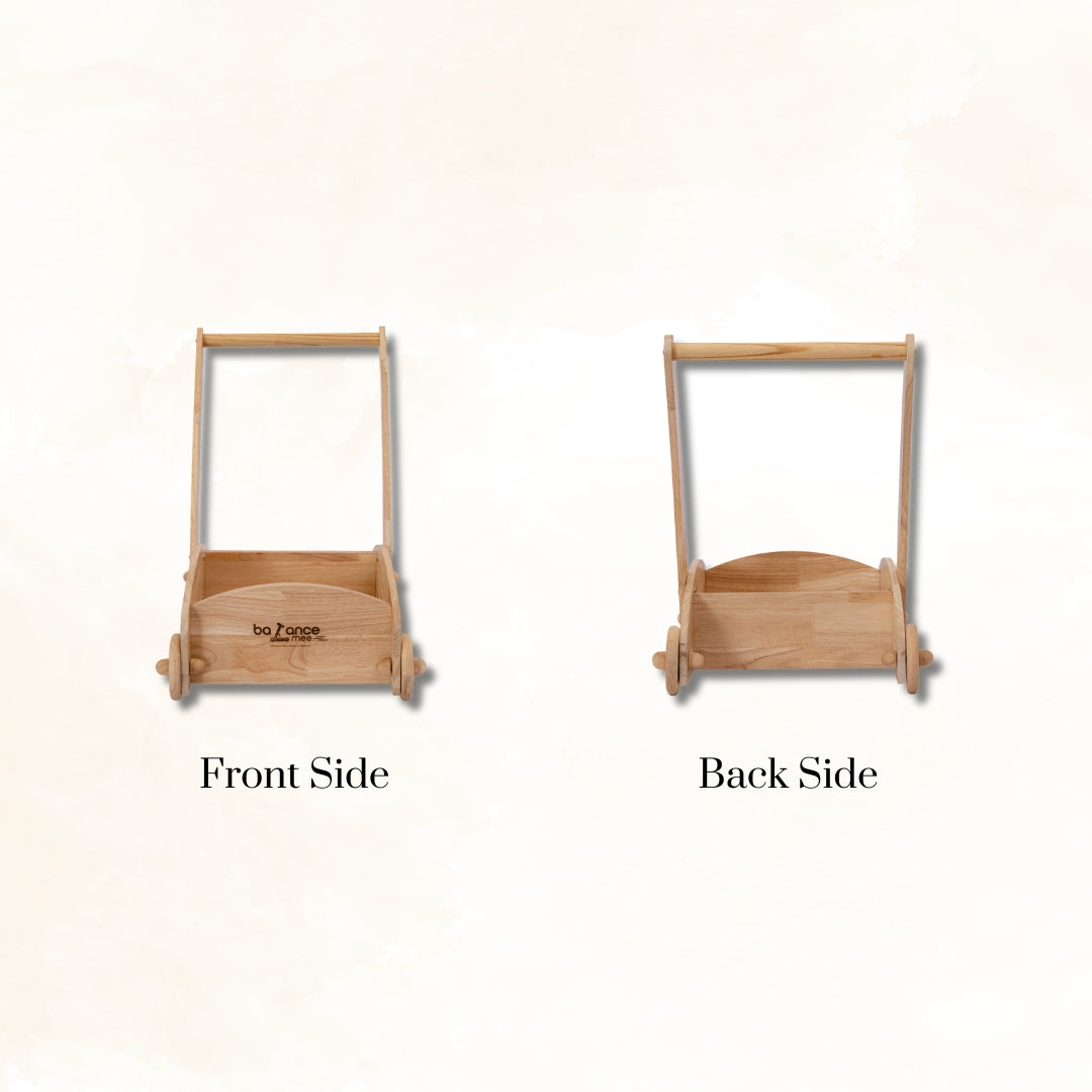 Its sturdy structure provides excellent support, while the smooth-rolling wooden wheels encourage natural movement and safe exploration. The trolley also doubles as a toy carrier, letting kids push around their favourite blocks, dolls, or books during playtime.